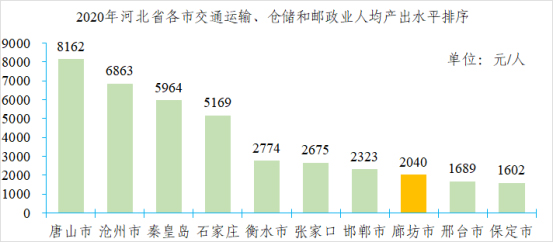 从物流产出来看,廊坊市物流行业产出水平仍有待进一步提高,从省内各城市横向比较来看,2020年,廊坊市交通运输、仓储和邮政业人均增加值仅为2040元/人,在全省各市中排名第九。