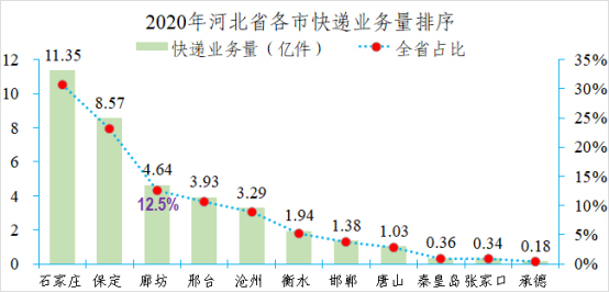 以快递业务量而言,廊坊市快递业务量由2016年的12864.54万件增加至2020年的46427.65万件,2020年快递业务量同比增长70.57%,在全省排名第3位,全国排名第38名。