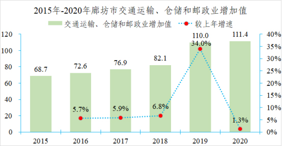 图1-1 2015年-2020年廊坊市交通运输、仓储和邮政业增加值