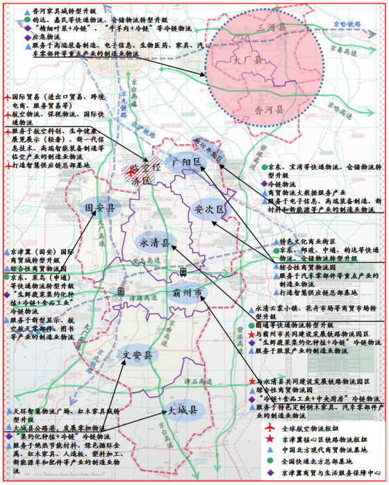 推动京津冀(固安)国际商贸城向供应链一体化服务转型升级,建设综合性商贸物流园;推动京东、菜鸟(申通)等快递物流在商业模式及业态方面转型升级;发展“生鲜蔬菜集约化种植+冷链+食品工业”冷链物流;发展服务于新型显示、航空航天零部件、图书等产业的制造业物流,创新发展供应链服务。
