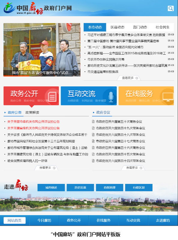 “中国廊坊”政府门户网站手机版与平板版是利用自适应新技术,为手机与平板用户访问提供智能响应,针对不同类型的移动终端用户提供优化的相应界面,满足不同类型用户浏览、访问的个性化需要,方便公众及时获取政府信息,加速政府网站服务的智能化。