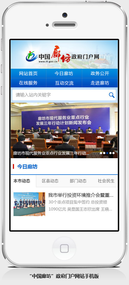 “中国廊坊”政府门户网站手机版与平板版是利用自适应新技术,为手机与平板用户访问提供智能响应,针对不同类型的移动终端用户提供优化的相应界面,满足不同类型用户浏览、访问的个性化需要,方便公众及时获取政府信息,加速政府网站服务的智能化。